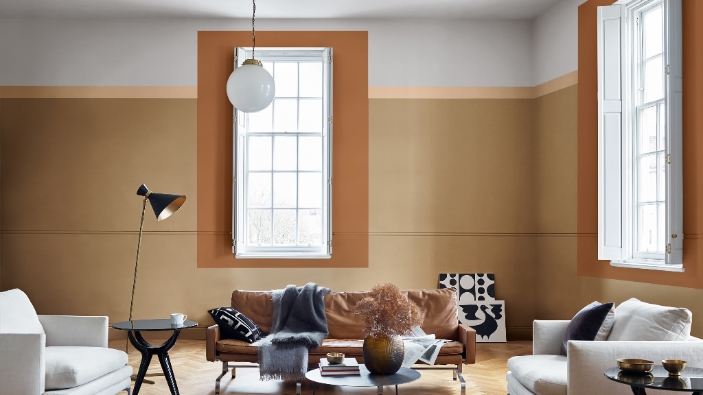 In this sophisticated living room, Creme Brulee, Dulux Colour of the Year 2019, makes a strong statement with its almost glowing amber tones, emphasized by the complementary warm neutrals that are used around the windows and to create a border next to the pale grey ceiling. Warm tan leather and graphic art and objects add to this striking look.